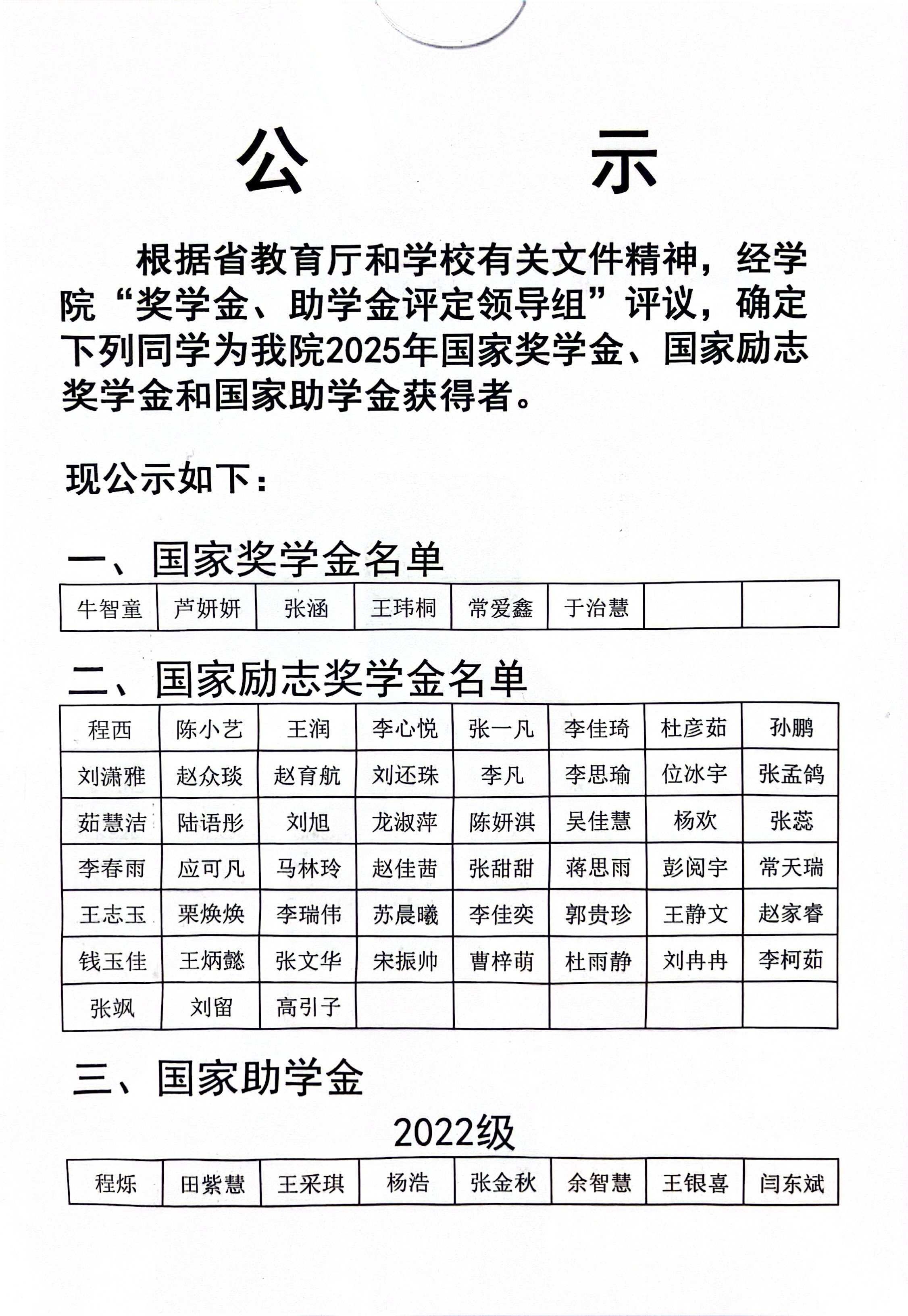 77779193永利2025年国家奖学金、国家励志奖学金和国家助学金公示名单
