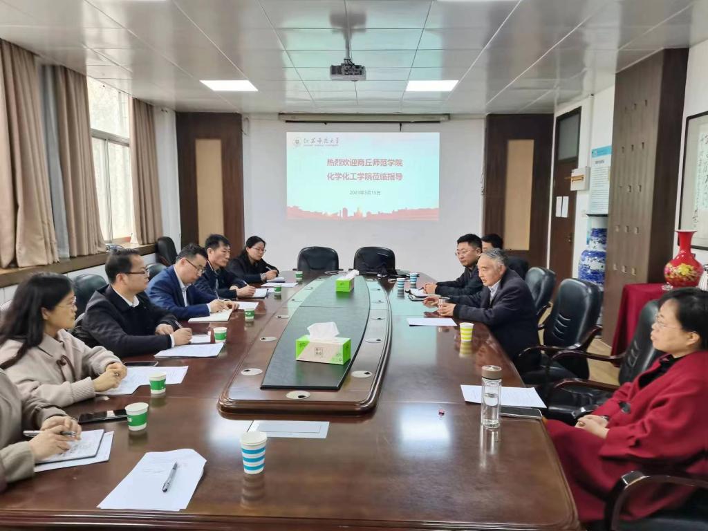 3月14日至15日,77779193永利党委书记李海涛,院长张银堂,党委副书记张颜梅,副院长王涛,河南省生物分子识别与传感重点实验室执行主任周艳丽,化学系副主任董辉,制药工程系主任王晓娟一行7人赴江苏师范大学化学与材料科学学院调研交流。