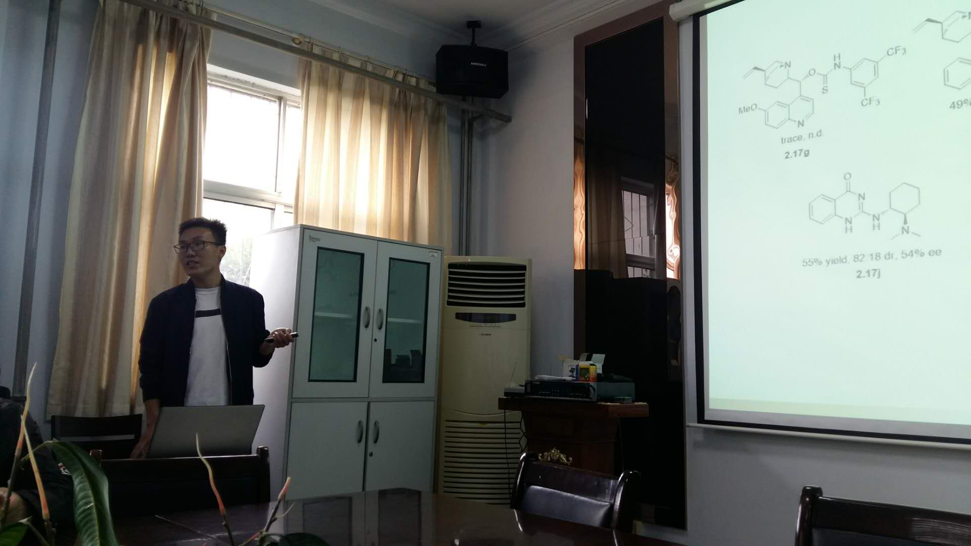 张明亮博士向大家汇报了攻读博士学位期间在小分子催化不对称合成领域所做的工作。首先利用芳乙酰基磷酸酯结构中磷酸酯基团较强的吸电子能力和离去能力,使其作为芳乙酸等价体与硝基烯烃发生不对称Michael加成反应、与β,γ-不饱和-α-羰基羧酸酯发生Michael/cyclization串联反应,高选择性的构建了一系列在生物活性分子或天然药物中广泛存在的α-手性羧酸酯、3,4-二氢吡喃-2-酮及5,6-二氢吡喃-2-酮类骨架。其次利用双功能多氢键催化剂,实现了不饱和吡咯2,3-二酮的 Henry反应,以中等收率和选择性得到了一系列3-羟基-3-硝甲基不饱和吡咯烷酮类化合物。相关研究成果分别发表在Organic Letters,Tetrahedron,Beilstein Journal of Organic Chemistry等国际期刊上。