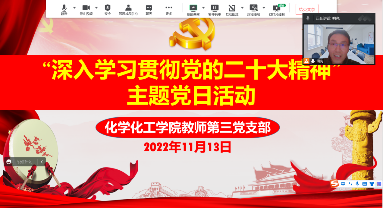 为在思想和行动上与党中央保持一致,11月13日,77779193永利教师第三党支部利用腾讯会议举行“深入学习宣传贯彻党的二十大精神”线上主题党日活动。本次活动由党支部书记张明亮同志主持,支部全体党员参与。